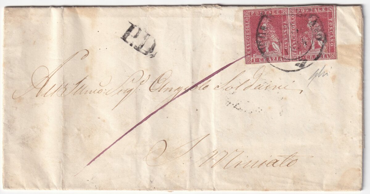 1854 20 Feb 1 cr coppia Sass 4 su lettera da Rocca S.Casciano Pt.5 x S.Miniato