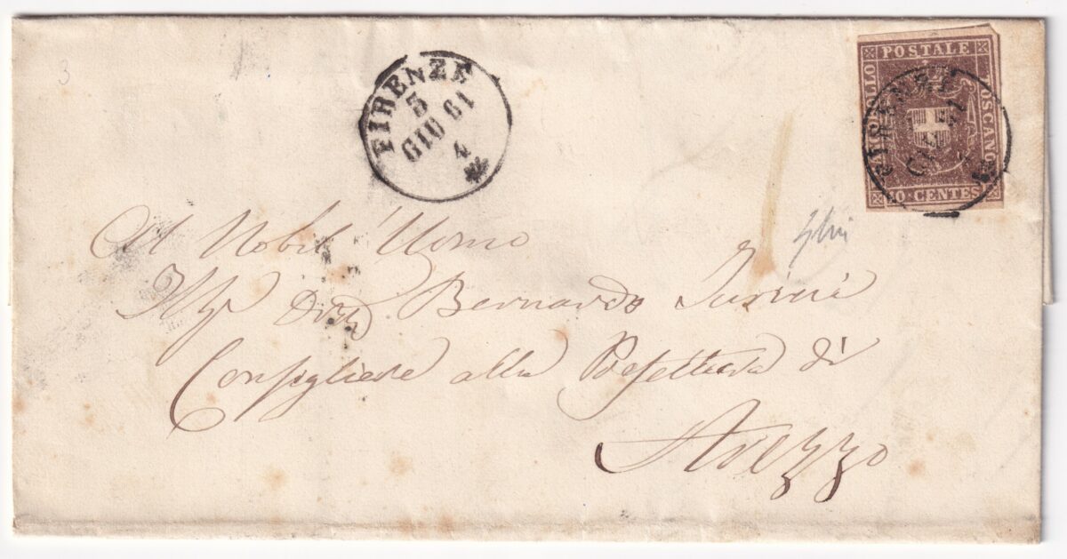 1861 5 Giu 10 c. Sass 19 data tarda su sovracoperta da Firenze x Arezzo